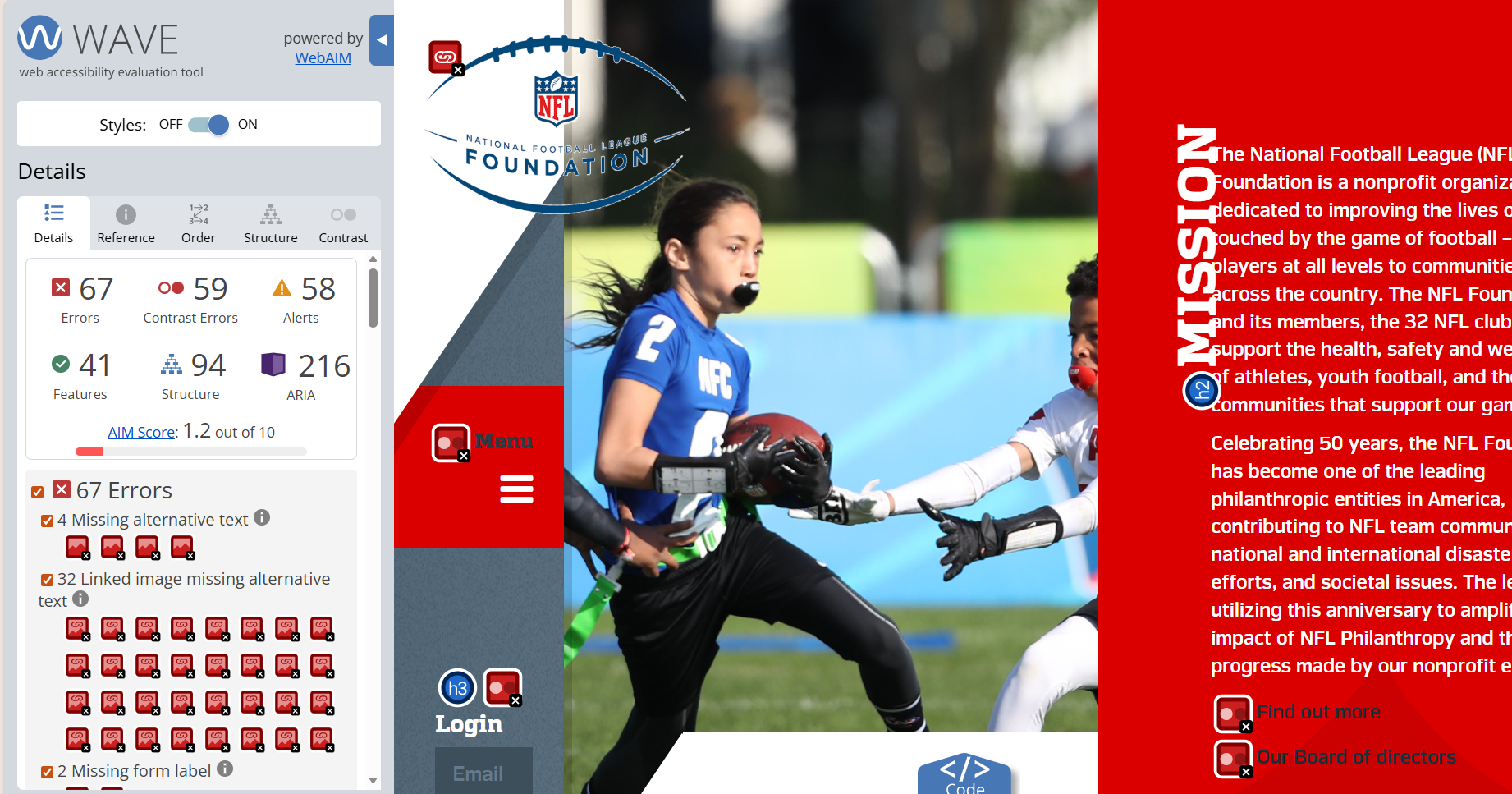 This case study presents an accessibility audit of the NFL Foundation website, evaluated against WCAG 2.1 Level AA standards. The audit focused on identifying barriers that could prevent users with visual, motor, or cognitive disabilities from fully accessing content and functionality.